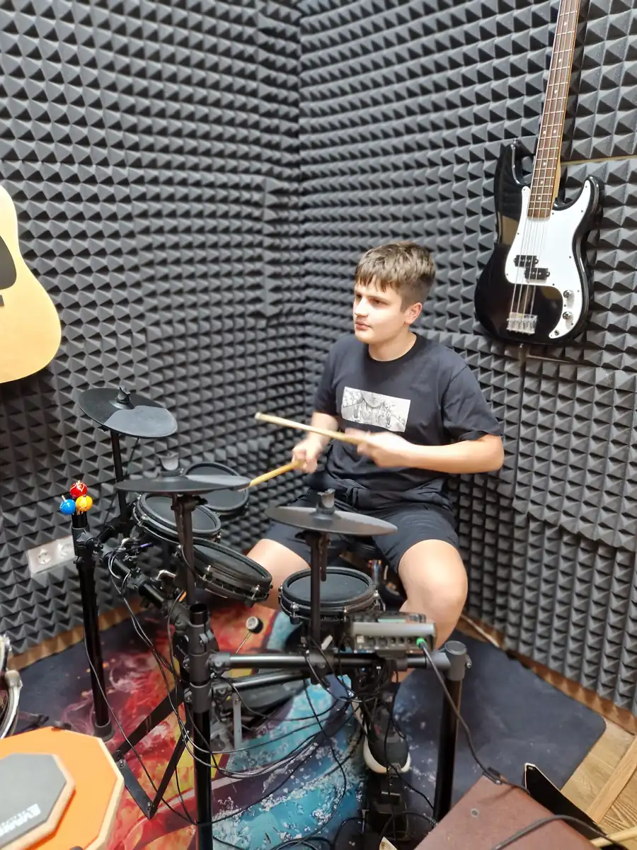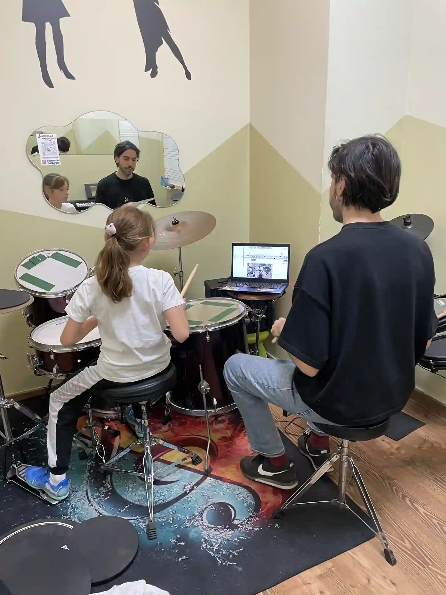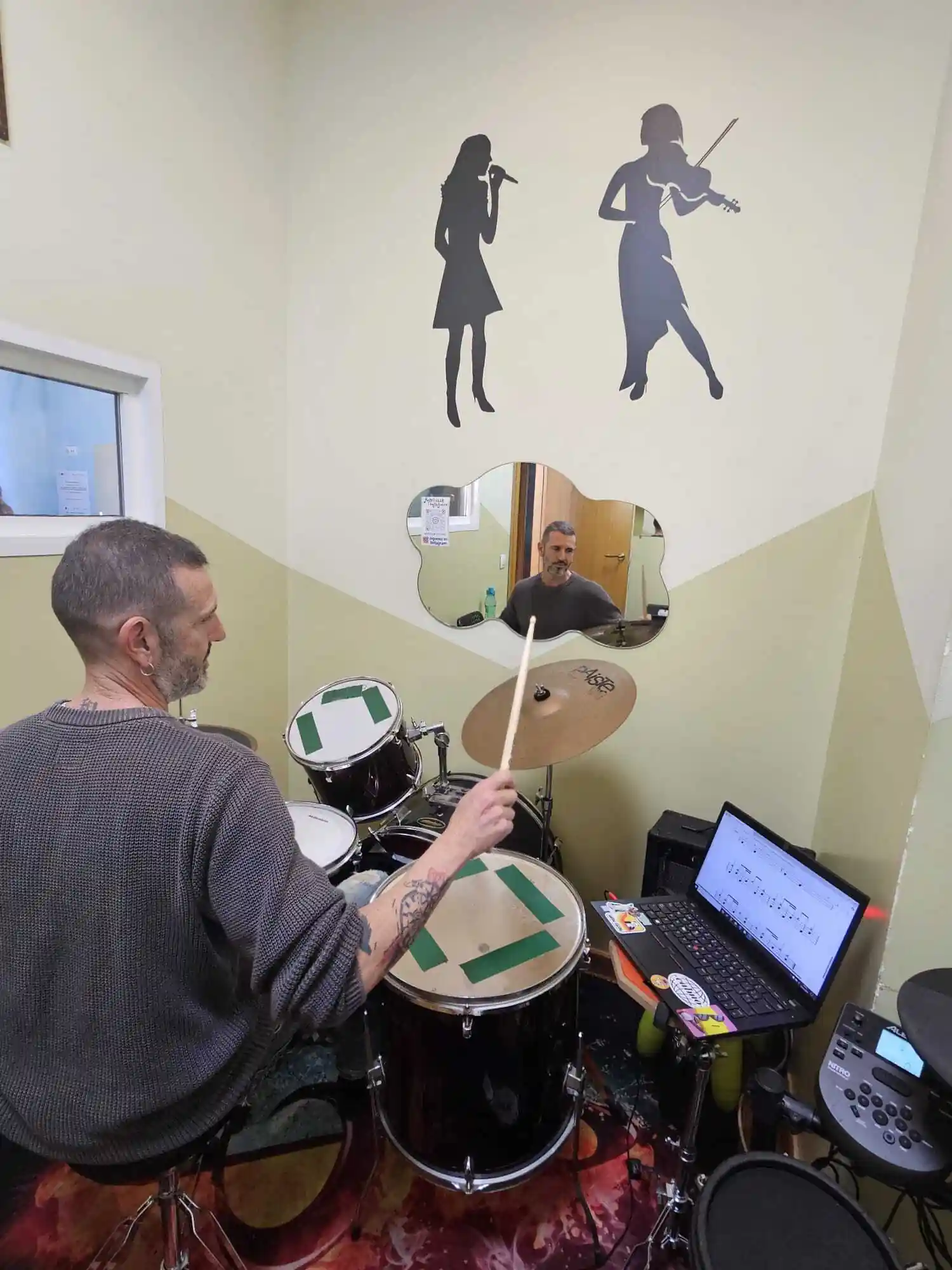 • Equipamiento Profesional: No necesitas invertir en un instrumento para empezar. Ponemos a tu disposición baterías de alta gama en nuestras aulas insonorizadas.